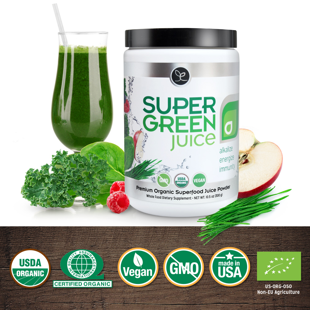 Super Green Juice is prepped and ready to mix in seconds, making any smoothie, juice or shake instantly healthier. It has a refreshing light taste with organic raspberry and organic apple flavors, and NO added sugar.